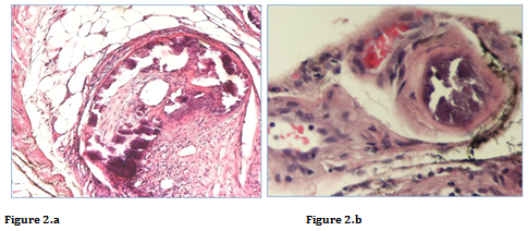 Figure 2 Photomicrograph (original magnification x10; Hematoxylin and eosin stain) showing extensive calcification of the vessel with endovascular fibrosis causing marked vascular luminal obliteration [2.a]. Photomicrograph (original magnification x 20; Hematoxylin and eosin stain) showing luminal occlusive small vessel calcification [2.b].