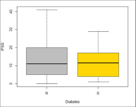 Figure 3 International Prostate Score Symptoms values (IPSS) in non-diabetic (N) and diabetic (S) individuals. p>0.05. Brasília, DF, 2020.