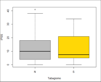 Table 2 International Prostate Symptoms Score (IPSS) values in non-smokers (N) and smokers (S). Brasília, DF, 2020. p>0.05