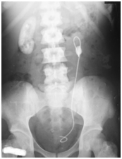 Figure 1 Abdominal X-ray of subject 2, showing a left sided upper ureteric calculus with the stent in situ. Calcified left kidney outline is visible, while the right sided kidney appears radio-opaque due to heavy deposition of calcium oxalate. Note the high density of the bones due to oxalate deposition (bone oxalosis).