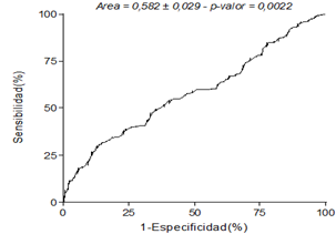 The accuracy of PSA markers to diagnose PCa was analyzed. Figures 1–4 shows the ROC curves and their corresponding Area Under the Curve; demonstrating that the marker that best-enabled identification of patients with PCa CaP was PSAD (66% accuracy) (Figure 1) followed by total PSA (58% accuracy) (Figure 2). Figure 3 and Figure 4 show the curves of F/T PSA index and (F/T)/PSAD, in which lower precision of these markers was observed.