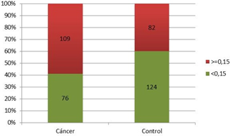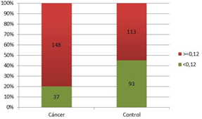Figure 5 shows that with a PSAD cut-off point of 0.12, the proportion of patients diagnosed with PCa was significantly higher (80%; p=0.0001; Chi-Square Test) than controls. In addition, the strength of the association was estimated, determining that patients were three times more likely to belong to the cancer group when presenting PSAD values greater than 0.12 (OR=3.04; CI 95% [1.84; 5.04]).