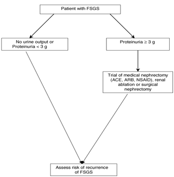 It is advisable that patients with FSGS have minimal proteinuria at the time of transplantation; this will help in early detection of significant proteinuria post transplantation [3]. Thus, patients with significant proteinuria should have a trial of non-steroidal anti-inflammatory drugs (NSAIDs), with or without an angiotensin-converting enzyme inhibitor (ACEI) or angiotensin II receptor blocker (ARB) as illustrated in Figure 2. These drugs may induce what is called medical nephrectomy associated with the shutdown of the remaining kidney nephrons. Moreover, in case this strategy failed, and significant proteinuria persists, nephrectomy may be considered [3]. Early diagnosis of FSGS recurrence will allow early initiation of therapy, which may reverse proteinuria and preserve kidney function [4,6]. However, Recurrent FSGS will result in allograft loss in more than 50% of cases [4,7].