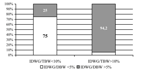IDWG is directly associated with calorie and protein intake and better nutrition status [1-4,21]. It is speculated that the positive influence of IDWG on nutritional status is more prominent than the negative effects of hypervolemia and hypertension caused by high IDWG [11]. In our study, the lowest incidence of MICS markers was recorded in patients in group 3. This result confirms positive effect of higher IDWG, since these patients are considered to be well nourished and have adequately controlled fluid balance. Nevertheless, a clear distinction should be made between high IDWG reflecting isolated dietary non-compliance as opposed to good nutritional status. Dietary recommendations for HD patients should be well tailored not to have negative influence on the quality of nutrition. Sodium intake certainly is the most important factor, but sodium dialysate concentration, saline infusions during HD or hyperglycemia in diabetic patients can also cause thirst [22,23]. Volume overload is associated with adverse outcome in HD patients, so it is advisable to employ the recommended strategies for maintaining adequate fluid balance in these patients [9].