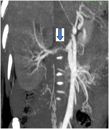 Figure 1 Computed tomography angiogram of renal artery demonstrates single right renal artery with narrowing of its caliber at the proximal part (the arrow)