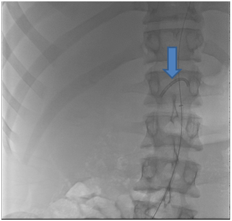 A 19 years old male patient, who was suffering from severe hypertension which was not controlled despite 5 antihypertensive drugs. Routine investigations revealed high serum creatinine 7.3mg/dl, serum K; 2.8meq/L with normal other lab results. The patient urine output was approximately 1000 ml per day. On examination, blood pressure was 240/110, bilateral midzonal and basal crepitation of chest, mild bilateral lower limb edema, and respiratory rate was 32/minute and hypoxia (So2 was 85 %) were reported. Therefore, the patient received oxygen support and hemodialysis (HD) session with ultra filtration of 4 liters on a provisional diagnosis of pulmonary edema with improvement of the patient. Renal ultrasound revealed small sized atrophic pyelonephritic left kidney and the right kidney size was 12.5*4 cm with normal sonoghraphic appearance. Renal Doppler showed absent diastole in most of waves of the right renal vessels, resistive index (RI) of right main renal artery was 0.82 with peak systolic velocity (PSV) 22 cm/s and RI of right intrarenal artery was 0.87 with PSV 12.7cm/s. Right renal artery stenosis was diagnosed and confirmed by computed tomography angiogram (CTA) which detected single right renal artery with narrowing of its caliber at the proximal part (16 mm) (Figure 1). Renogram had shown severe parenchymal tracer (MAG3) retention in the affected right kidney mostly due to renal artery stenosis and non-functioning left one. Thus, right renal angioplasty with stenting was decided. But, the procedure complicated with broken guide catheter tip (about 3 cm lengths) and the distal part was impacted in the renal artery and the proximal part in the aorta (Figure 2). Consequently, immediate abdominal exploration was done for removal of the broken part. The surgery passed smoothly and the patient referred to ICU with stable hemodynamics. The patient maintained on HD and hypertensive drugs for 3 weeks then the patient underwent a successful right renal angioplasty with two stents fixation (Figure 3).The blood pressure and serum creatinine started to improve, HD was stopped and the patient was discharged after 2 weeks with serum creatinine 0.9mg/dl, four antihypertensive drugs, warfarin and aspirin with cessation of warfarin six months later. Currently, the patient has maintained on 2 antihypertensive drugs, aspirin with stable kidney function and controlled blood pressure.