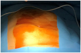 We present here the case of a 50-year-old woman who consulted for a mild right low back pain with palpable abdominal mass since several months. The clinical examination revealed a painless tumefaction of the right iliac fossa (Figure 1). A CT-scan performed showed a large right retroperitoneal cystic polylobed mass, well limited, measuring 15 cm x 10 cm x 9 cm, pushing forward the digestive loops and pushing up the right kidney, containing calcifications, without enhancement after contrast injection, and without evidence of adjacent structures infiltration, evoking a retroperitoneal cystic lymphangioma (Figure 2) and (Figure 3). The patient underwent an exploratory laparotomy, which showed a large whitish retroperitoneal cyst, extending from the right iliac fossa to the right hypochondrium (Figure 4). Given the appendix was not individualized, we suspected then, during surgery, an appendiceal mucocele. During dissection, we assisted to a tumoral rupture, and approximately 500 milliliters of a thick, gelatinous mucoid substance was sucked. The peritoneal cavity was already protected by surgical drape. We went an en-bloc and complete resection of the tumor (Figure 5). The post-operative course were normal. The histological study concluded to a mucinous cystadenoma (Figure 6). After a one-year follow-up, control CT-scans showed no signs of recurrence.
