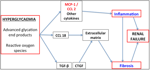Figure 1 Pathogenesis of diabetic nephropathy. Hyperglycaemia results in the production of advanced glycation end products and reactive oxygen species, leading to cell signaling and release of MCP-1, TGF-β and CTGF. These cytokines have key roles in the inflammatory and fibrotic processes that are part of diabetic nephropathy. CCL2: CC chemokine ligand 2; TGF-β: Transforming Growth Factor Beta; CTGF: Connective Tissue Growth Factor