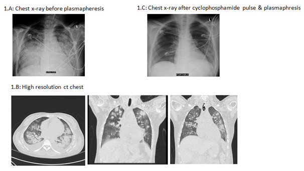 Figure 1 Chest radiography: 1(A) Chest x-ray before start of plasmapheresis shows extensive pulmonary edema, basal consolidation. 1(B) High resolution CT showed bilateral mid-zonal and lower lobe ground glass opacities, bilateral pleural effusions, mild pericardial effusion. 1(C) Chet x-ray shows recovery after pulse cyclophosphamide and plasmapheresis.