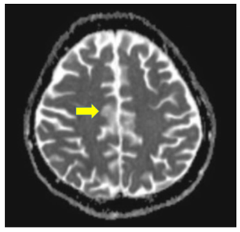 Chest condition failed to improve, a second pulse of cyclophosphamide was given followed by partial improvement of chest condition regarding ventilation parameters and radiology (x-ray). High resolution CT (HRCT) chest was requested, during transferring the patient to CT room, she developed sudden attack of hemoptysis associated with sudden worsening of her chest x-ray. Urgent bronchoscopy was done and revealed alveolar hemorrhage. Plasmaphereses was initiated and combined with ultrafiltration. After 3 sessions of plasmapheresis marvelous clinical recovery was noted, patient urine output started to improve with satisfactory levels, her creatinine dropped to 1.6 mg/dl without hemodialysis. Her chest x-ray improved, patient oxygenation and ventilation parameters improved and successfully weaned from mechanical ventilation. Patient was transferred to the ward, after 5 days from the last cyclophosphamide pulse she developed sudden grand male fits, magnetic reasoning image brain (MRI) revealed picture coop with lupus cerebritis (Figure 3). The 3rd dose of cyclophosphamide was given and she was discharged home with improved condition to be maintained on mycophenolate mofetil 500 mg every 12 hours plus 40 mg prednisolone oral with plan of weaning in the following months according to her general condition.