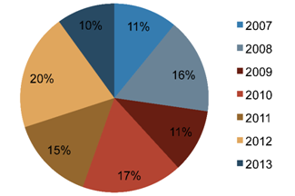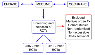 After the removal of duplicate articles among the databases, the investigator compiled a list of articles that required individual screening according to the study inclusion and exclusion criteria. Screening led to the exclusion of many RCTs, most of which involved double-organ transplants. Others were excluded because they were cohort, non-randomized or cross-sectional studies. The final list of RCTs was then divided into two arms: one arm constituting studies published from the beginning of 2007 until the end of June 2010 and the other arm containing studies published from July 2010 until the end of 2013 (Figure 1).