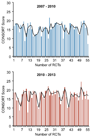 This improvement in the reporting standards of the more recently conducted RCTs may be explained by more than one reason. First, awareness of the CONSORT guidelines has certainly improved greatly. Investigators are now better trained than before about various aspects of clinical trials, including manuscript writing and the reporting of clinical trials. Some of this training has even extended to undergraduate and postgraduate programs, cultivating an environment for research, which might explain the difference between the reporting standards of the two study periods. More experienced and trained mentors now guide junior authors before manuscripts are submitted for publication, potentially explaining these results. Additionally, many of the publishing journals endorse the CONSORT guidelines; thus, acceptance or rejection of an article in the journal may depend on the degree of compliance to the guidelines.