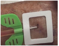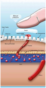 During 2016 Nephrokit patented a new device Mozaik (Figure 3) transparent adhesive patch surrounded by foam frame to reduce blood leak at needle removal. Mozaïk dressing is a new compressive microperforated adhesive transparent device, surrounded by foam to increase the tightness around the puncture site after pulling off the needle. This device is tailored to fit with AVF anatomy. Advantages of the device are (Figure 4):
