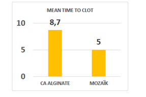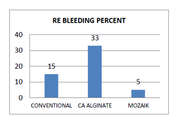 Possibility because it needs high pressure compression that reduces the flow which in turn prevents the incoming of coagulation factors to the puncture wound from the fistula. Mozaïk is the only device authorizes clot to be achieved from the vein puncture wound to the skin including the channel. The majority of published studies on AVF bleeding are only devoted to the study of compression time, but it appears that the re-bleeding of the AVF before the patient's discharge is very common with conventional devices and haemostatic dressings. Re-bleeding at the time to leave the dialysis facility is feared, but rarely reported in published studies. In recent non published prospective study (accepted abstract) (Figures 5 & 6). Guerraoui A.10 demonstrated superiority of Mozaîk to reduce by 3 the time to clot versus conventional gauze and by half the time to clot versus calcium alginate. He also found high significant difference of re bleeding episodes that happen in 33% of the patients with calcium alginate, 15% with conventional gauze and only 5% for Mozaïk (Figure 5). Moreover in this study authors reported high frequency of Re-bleeding episodes with Calcium alginate in comparison with Gauze or Mozaïk (Figure 6).