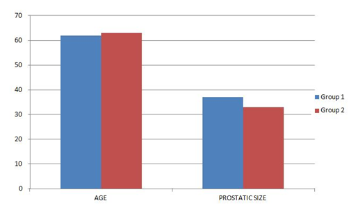 The mean value of prostatic size in group 1 was 37.1±10.19 while in group 2 it was 33±10.6 without a statistically significant difference (P=0.285) as in Figure 1.