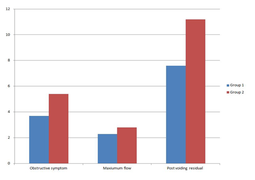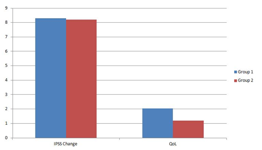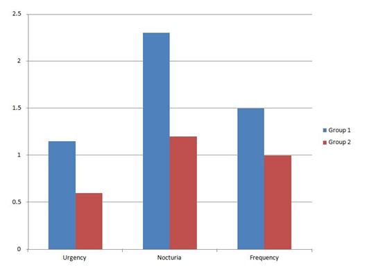 The score of all the 3 irritative symptoms, dropped down in both groups, but the mean change was only significant for nocturia, and in favor of group 1(Table 1), while the difference in the mean change for frequency and urgency, though clearly present, but it was not significant between the 2 groups.