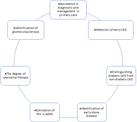 A pilot program utilizing e-technologies to identify CKD was done in Australia (Electronic Diagnosis and Management Assistance to Primary Care in Chronic Kidney Disease; EMPA-CKD). This was based on algorithms trained to detect at risk patients and to conduct appropriate screening tests for CKD.6 Almansour et al.,7 predicted the early stages of CKD by comparing Artificial Neural Networks (ANN) and Support Vector Machines (SVM) in 400 patients. ANN was superior to SVM with success of 99.5% and 97.75% respectively.7 Bermudez-Lopez utilized Random Forest (RF) to show that the Proprotein Convertase Subtilisin-Kexin type (PCSK9) is an important factor distinguishing diabetic CKD from non-diabetic CKD.8 Kazemi et al.,9 identified early stone disease in a group of 936 patients using the final ensemble-based model with an accuracy of 91.1% .9 Kanishk et al used an automated segmentation method of deep learning for total kidney volume (TKV) computed on CT dataset of 224 autosomal dominant polycystic kidney disease (ADPKD) patients. This resulted in rapid and reproducible diagnosis of ADPKD.10 TKV assessed by the automated approach correlated well with the manual approach but was associated with high precision and low bias.11 Wei et al created an automated quantification system for measuring interstitial fibrosis in 40 images and utilized 70 patients to prove the error rate which was 9% Figure 1.12