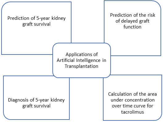 Kazi et al.,31 developed an algorithm that was based on Bayesian belief network which included other histological features in addition to the conventional tubulitis and intimal arteritis used in the Banff classification. The developed model improved the accuracy of diagnosis of acute transplant rejection even when the expertise of an experienced histopathologist was not available. Furness et al.,32 also developed a model that was useful in making the diagnosis of acute cellular graft rejection using a neural network. The model was created from 12 different histological features from 146 renal biopsies. The diagnostic performance of this model was found to be better than the use of the conventional methods. In fact, it was observed that a pathology trainee was able to make a more accurate diagnosis than the experienced pathologist with this model. Applications of AI in Transplantation are summarized in Figure 2.