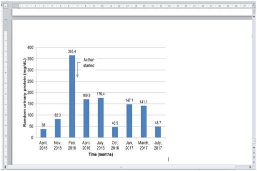 Figure 2 An abrupt increase in random urinary protein in February 2016. After Acthar treatment, proteinuria fell in 2 months.