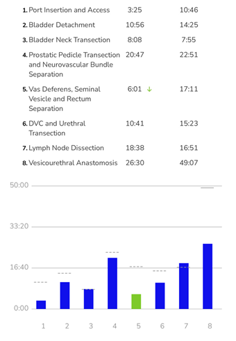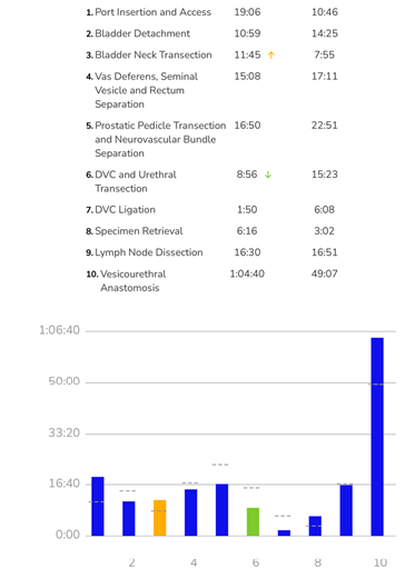 10 robotic-assisted laparoscopic surgeries were performed and data report from TS was stored, debriefed, and analyzed. Total time ranges between 90 to 265 min, average 150 min. The first 5 surgeries averaged 193 min (172-265), and the next 5 averaged 106.8 min (90-128), with an improvement of 45 minutes. Table 1 Comparison of TS results showed differences between the 5 first and 5 las surgeries in Vas Deferens, Seminal Vesicle and Rectum Separation (20 vs 13.9 min), Prostatic Pedicle Transection and Neurovascular Bundle Separation (28 vs 16.3 min), and Vesicourethral Anastomosis (65 vs 30 min) (P: 0.04, Pearson 0.99). Figure 1 & Figure 2 show the TS results in case 1 and 10.