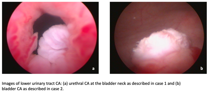 Treatment of urethral and bladder CA varies depending on patient factors and the number, size, and site of the lesions involved. Additionally, given the rare nature of urethral and bladder CA lesions, a consensus on appropriate treatment does not exist. The purpose of this article is to describe our experience with two cases of bladder CA and provide a narrative review of current treatment options for bladder and urethral CA described in the literature since 2010.