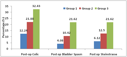 Materials and Methods: The medical records of 268 patients who underwent ureteroscopic lithotripsy (URSL) by a single surgeon from January 2010 December 2013 were reviewed retrospectively. All adult patients of mid and lower ureteric stones (10-22mm) were included in this study. Group I (n=98) patients had no DJ stent while Group II (n=96) patients had DJ stent due to prolong procedure. Group III (n=74) patients had DJ stent placed due to complications during the procedure or due to large volume of fragments that are left without retrieval after fragmentation. 28 patients required extracorporeal shockwave lithotripsy as during the procedure these patients had proximal stone migration.