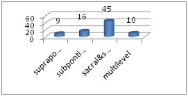 The total number of patients included in the study was 80 patients. There were 51(63.7%) males and 29(36.3%) females. The age range was 4 to 85years (mean 31.8years). The maximum number of patients was belonged to age group 15-30years (Table 1). Most patients 49 (61.3%) patients presented by incontinence of urine. Figure 1 shows various clinical presentations of all patients. On basis of CT and MRI our patients were classified into four categories according to their level of neurological lesion as shown in Figure 2. Most patients had sacral & subsacral lesions. Filling cystometry showed absent sensation in 37, decreased compliance in 46 and decreased maximum cystometric capacity (MCC) in 47 patients as shown in (Table 2). Detrusor overactivity (DO) was found in 47 (59%) patients. DO parameters are shown in (Table 3). Data of voiding cystometry of only 27 patients, those could able to void during the study are shown in (Table 4). Using the fluoroscopy during the study helps to add information about bladder configuration, vesicoureteral reflux (VUR), bladder neck abnormalities and external urethral sphincter as show in (Table 5).