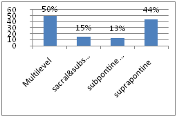 Normal micturition is a complex event dependent on the integration and modulation of neuronal pathways connecting the cerebral cortex, brainstem nuclei in the pons, and the sacral spinal cord.4‒6 In our study we found low compliance was more frequently in patients with multilevel (60%) followed by patients with sacral & subsacral lesions (42%) while patients with subpontine suprasacral lesions (37%) and patients with suprapontine lesions (33%) with no significant difference between the level and compliance (P value 0.63). Soler J et al., Hackler R et al., Light J et al. and Cardenas D et al.; confirmed that the level of the lesion influences the incidence of low compliant bladder which were more frequent in patients with sacral vs suprasacral lesions.