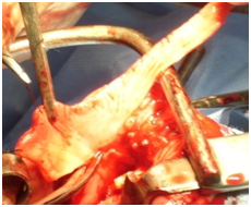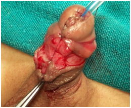 For cases associated with chordee still present after degloving dorsal tunica albuginea plication at 12o, clock as the Baskin & Lue.10 modification of the technique described by Baskin & Duckett.11 Buccal mucosal only urethroplasty then carried out starting by a few millimeters incision of the original meatus, to avoid post-operative urethral stricture that commonly occurs in this site, then the tip of the graft fixed to the meatus with 6-zero poliglecaprone sutures over a polyurethane catheter for both stenting and bladder drainage then completing the repair with continuous running sutures fixing the graft to both urethral plate wings till near the tip of the glans (Figure 4 & 5). Second layer coverage of the neourethra was then secured over the urethra extending it to the deep groove under the glans wings. Tunica vaginalis flap used in 18 cases (11 in group one &7 in group two) or subcutaneous dartos flap which used in 14 cases (9 in groups one & 5 in group two) as a second layer. Finally, skin coverage was done, by using the prepuce by Bayer flap technique, or by approximation of the penile skin in the ventral surface of the penis. Urethral stents extended to the bladder as a urethral catheter to compress it for 7 to 10 days (Figures 6 & 7).
