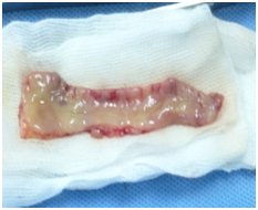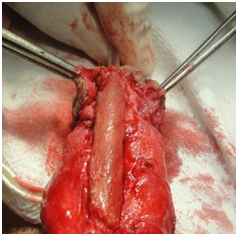 32 Patients included in this study divided in two groups. The 1st group operated in one stage including 20 patients (8 primary, 6 crippled, 6 fistulae) and the 2nd group operated in two stages including 12 patients (8 primary, 4 crippled) in the 1st stage correction of associated genital anomalies done followed by urethroplasty 6 months later. 12 patients (37.5%) had 14 genital anomalies 8 pts (25%) had penile chordee (5 primary and 3 crippled), 2 pts (1 fistula and 1 in crippled) had penile rotation and 2 pts (1 primary and 1 crippled) had both chordee and penile rotation (Figure 1 & 2). Under general anesthesia with patient in supine position, two teams working simultaneously to decrease anesthesia time and leaving urethroplasty team to concentrate in his job. The harvesting of buccal mucosa from the lateral cheek was done with a technique similar to that described by Eppley et al.1 using an intraoral retractor and infiltrating the graft area with 1:200,000 epinephrine. The outlined graft is sharply dissected and removed, leaving the muscle intact. The donor site is carefully examined for bleeding. The graft length varied from 2.4 to 12.5 cm, which was 20% more than the urethral plate defect length (2-10.4 cm) (Figure 3a & 3b). The harvesting site is closed with 5-0 polyglactin continuous suture. Any fat or minor salivary glands harvested with the graft carefully removed to enhance graft survival.