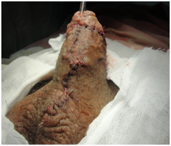 Fistula cases were associated with distal obstruction, incision made from the fistula to the tip of the glans creating hypospadias. Operative time ranged from 60 minutes to 110 minutes with mean of 81.5minutes. In group one it ranged from 70-110 (mean 84m), with time of graft harvesting ranged from 15 to 23minutes. In group two in 2ND stage it ranged from 60to 100 minutes (mean 79) with time of graft harvesting ranged from 18 to 27minutes. Follow up in group one ranged from 6 to 30 months with mean of 20 months while in group two it ranged from 6 to 24 months with mean of 17 months. Conservative management carried out for early complications as following. For edema NSAIDS used, for bleeding changing the dressing with compressive one in addition to anti bleeding drugs, for infection frequent changing the dressing with application of local antibiotic spray and for both glans and wound dehiscence frequent dressing and treatment of infection if present. For late complications conservative management was regular dilatation for both meatal stenosis and urethral stricture.